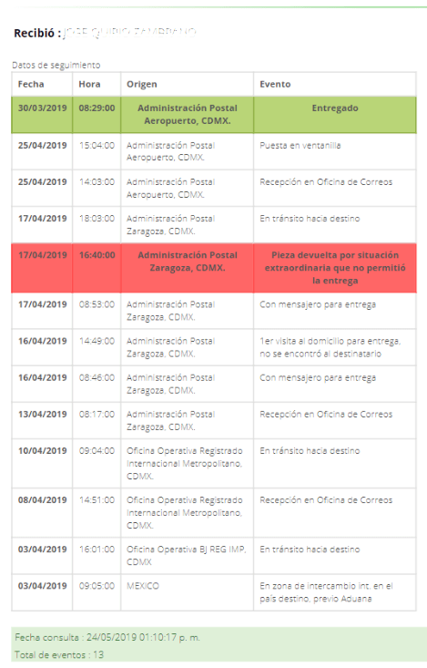 | 'En zona de intercambio int. hacia el país destino, previo Aduana': viajando a México | '2da visita al domicilio para entrega, no se encontró al destinatario' | 'Pieza devuelta al no ser recibida o reclamada por el destinatario' | |